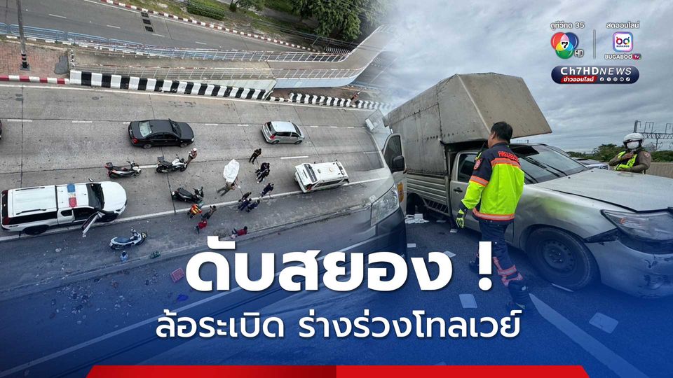 อุบัติเหตุสยอง ! รถกระบะตู้ทึบล้อระเบิด เสียหลักหมุนชนแบริเออร์ ร่างคนร่วงตกจากโทลเวย์ เสียชีวิต 1 คน และมีผู้ได้รับบาดเจ็บ ที่อยู่ในรถอีก 4 คน
