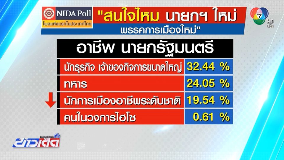 ข่าวเด็ด 7 สี - ประชาชนยังต้องการนักธุรกิจ มาเป็นนายกรัฐมนตรี และอายุต้องอยู่ในช่วงเลยวัยกลางคนไปแล้ว มีแนวโน้มเลือก สส. ที่มาจากพรรคการเมืองใหม่