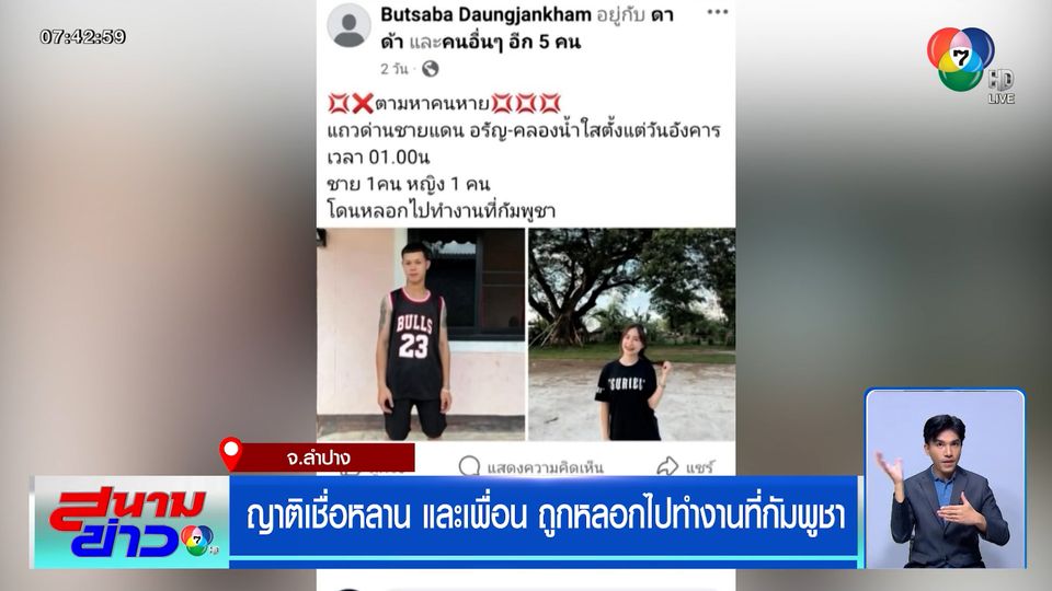 สนามข่าว 7 สี - ครอบครัวชาวจังหวัดลำปาง ตามหาหลานชาย และเพื่อนสาวอีก 1 คน เชื่อว่าถูกหลอกข้ามไปทำงานฝั่งกัมพูชา
