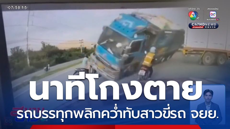 สนามข่าว 7 สี - คลิปนาทีเฉียดตาย รถบรรทุกขับทางตรง หักหลบรถบรรทุกอีกคันที่กำลังเลี้ยวตรงจุดกลับรถ ทำให้พลิกคว่ำทับรถจักรยานยนต์ที่จอดรอเลี้ยวเหมือนกัน