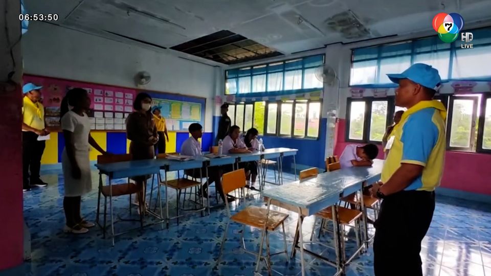 เช้านี้ที่หมอชิต - ที่จังหวัดสุรินทร์ ฝ้าเพดานอาคารเรียน พังจากแรงสั่นสะเทือนปืนใหญ่ เด็กนักเรียนต้องนั่งเรียนกลางห้องเรียนฝ้าเพดานพังไปก่อน เพราะต้องรอรับงบซ่อมแซมจากรัฐ