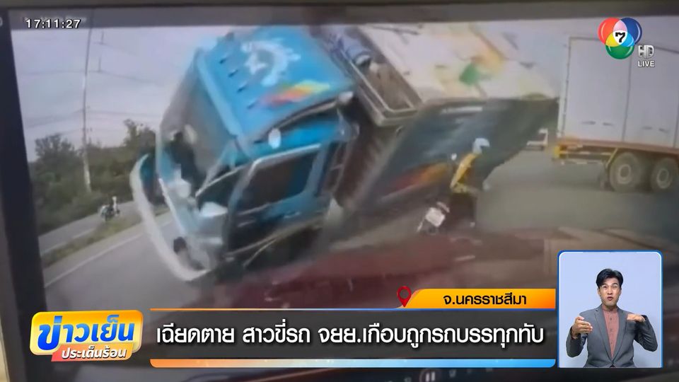 ข่าวเย็นประเด็นร้อน - ไปที่จังหวัดนครราชสีมา มีอุบัติเหตุระทึก เรียกว่ารอดตายกันแบบหวุดหวิด สำหรับสาวโรงงานรอกลับรถจักรยานยนต์ อยู่ดี ๆ มีรถบรรทุกเข้ามาจนเกือบทับ