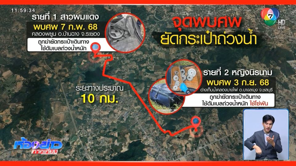 ห้องข่าวภาคเที่ยง - ตำรวจ สภ.ห้วยใหญ่ แกะรอยผู้ต้องหา ใครฆ่าสาวนิรนาม ยัดใส่กระเป๋าเดินทาง ซึ่งตำรวจตั้งข้อสันนิษฐาน เหตุการณ์ครั้งนี้ คล้ายกับคดีฆ่าสาวผมแดง ที่ จังหวัดระยอง ที่เหตุการณ์ห่างกัน แค่ 7 เดือน
