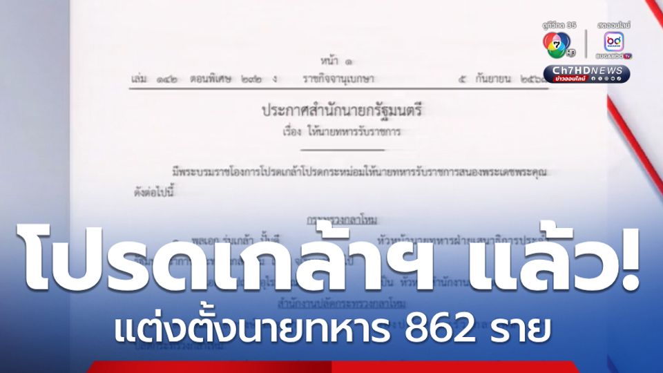 ห้องข่าวภาคเที่ยง - มีพระบรมราชโองการโปรดเกล้าโปรดกระหม่อมให้นายทหารรับราชการสนองพระเดชพระคุณ รวม 862 ราย