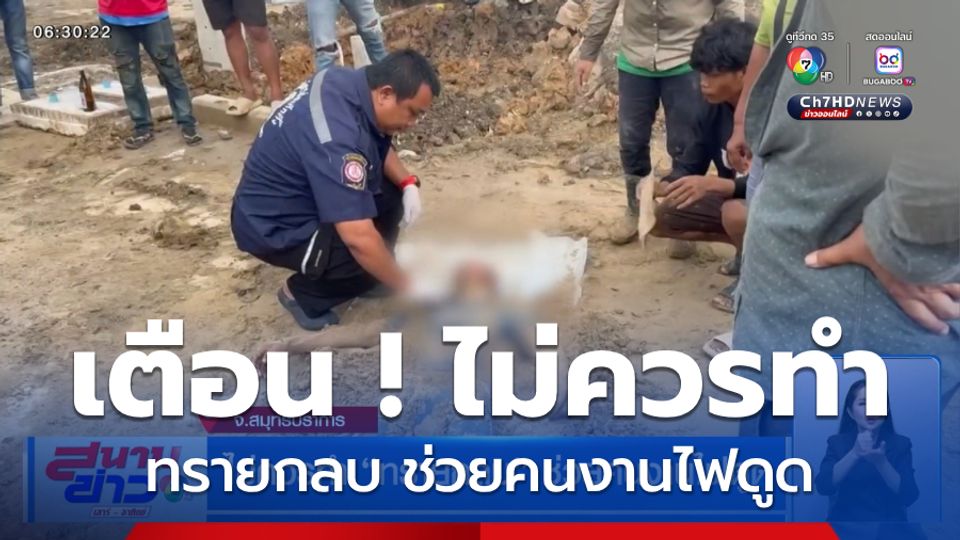 สนามข่าวเสาร์-อาทิตย์ - ที่จังหวัดสมุทรปราการ เกิดเหตุคนงานถูกไฟดูดจนหมดสติ เพื่อนร่วมงานรีบวางบนแผ่นสังกะสีเอาทรายกลบทั้งตัว เป็นความเชื่อว่าจะช่วยชีวิตได้