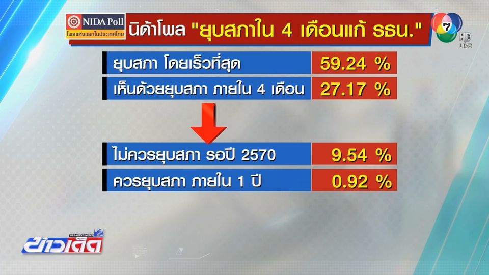 ข่าวเด็ด 7 สี - นิด้าโพล สำรวจความเห็นประชาชนที่มีสิทธิเลือกตั้ง ส่วนใหญ่ต้องการให้ยุบสภาเร็วกว่า 4 เดือนและแก้ไขรัฐธรรมนูญรายมาตรา