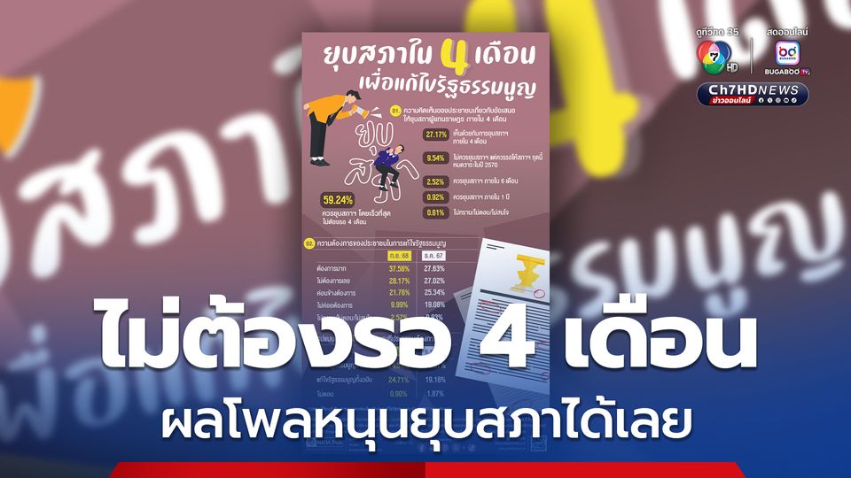 นิด้าโพล เผยผลสำรวจคนไทย 59.24 % หนุนยุบสภาเร็วที่สุด ไม่ต้องรอ 4 เดือน ขณะที่เสียงร้อยละ 37.56 ต้องการแก้รัฐธรรมนูญมาก