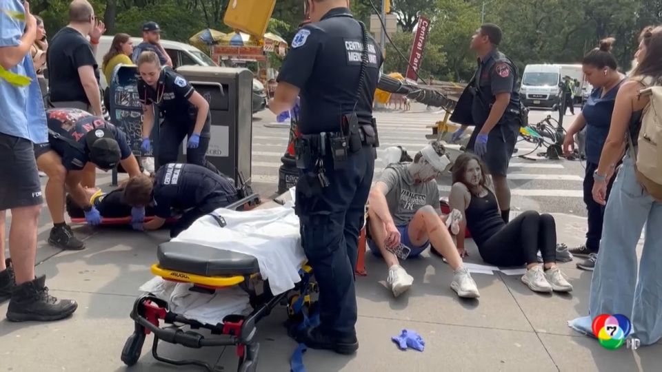 เป็นภาพขณะที่เจ้าหน้าที่กำลังให้ความช่วยเหลือ ผู้ที่ได้รับบาดเจ็บ 4 คน ซึ่งถูกเสาสัญญาณไฟสัญญาณจราจรล้มทับ บริเวณทางแยกหัวมุม ถนนเวสต์ เอทตีเฟิร์สท์ กับ เซ็นทรัลพาร์ค ย่านแมนฮัตตัน นครนิวยอร์ก สหรัฐฯ ช่วงสายวานนี้ ตามเวลาท้องถิ่นสหรัฐฯ ผู้เห็นเหตุการณ์บอกว่า รถบรรทุกคันหนึ่งขับไปเกี่ยวสายไฟ จากนั้นก็ดึงเสาสัญญาณไฟจราจรล้มลงทับผู้คนที่เดินอยู่บริเวณดังกล่าว ซึ่งจากน้ำหนักของเสาสัญญาณไฟจราจร เคราะห์ดีมากที่ไม่มีใครได้รับบาดเจ็บรุนแรงถึงเสียชีวิต