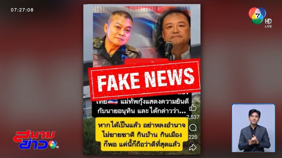 สนามข่าว 7 สี - นับถอยหลังเหลืออีกไม่ 20 วัน "แม่ทัพกุ้ง" ก็จะเกษียณอายุราชการ แต่ไม่วายมีข่าวเฟกนิวส์ปั่นกระแสชวนให้ต้องปวดหัวอยู่เรื่อย ๆ ล่าสุดถูกตัดต่อภาพโยงปมการเมือง รัฐบาลขั้วใหม่ภายใต้การนำ นายกฯ อนุทิน