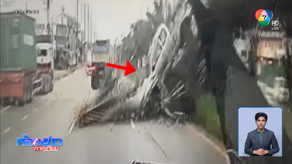พุ่งข้ามเลนมาอย่างเร็ว สังเกตคลิปจะเห็นว่าต้นปาล์มกระเด็นแบบมาถอนรากถอนโคน ส่วนรถกระบะคันติดกล้อง หักหลบไปชนกับรถบรรทุกพ่วงที่จอดอยู่ริมทาง เหตุเกิดบริเวณถนนสิริโสธร จังหวัดฉะเชิงเทรา ช่วงเช้าวันนี้ และนี่คือสภาพของรถกระบะคันต้นเหตุ ตัวถังด้านหน้าพังเสียหายอย่างหนัก กระจกแตกร้าว หลังคายุบ ชายคนขับรถพุ่งข้ามเลน บอกสาเหตุมาจากคันเร่งค้าง ทำให้รถเสียการควบคุม ด้านผู้เสียหาย ซึ่งเป็นชายอายุ 57 ปี ระบุผมตกใจมาก เคราะห์ดีที่ไม่บาดเจ็บ