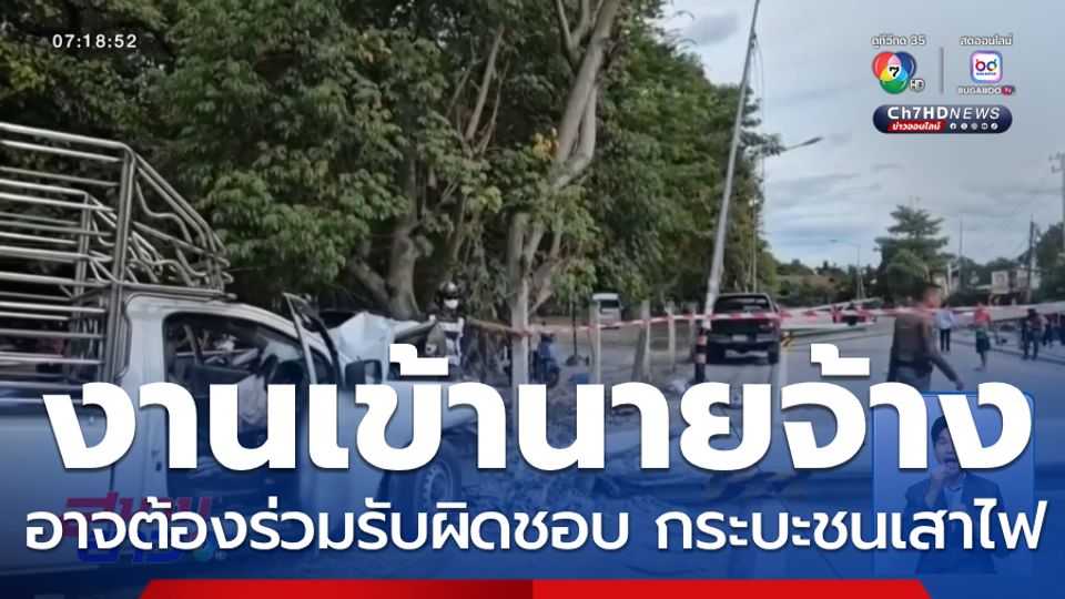 สนามข่าว 7 สี - ต้องบอกว่างานเข้าเต็ม ๆ กรณีรถกระบะส่งน้ำดื่มเสียหลักหลุดโค้งชนเสาไฟฟ้า ที่ จังหวัดเชียงใหม่ เสียหาย 52 ต้น รวมทั้งบ้านชาวบ้าน ร้านอาหาร 26 หลัง และรถยนต์ของผู้อื่นอีกเพียบ คาดว่ามูลค่าความเสียหายแตะเกินหลักสิบล้านบาท แต่รถมีวงเงินประกันแค่ 600,000 บาท ซึ่งตำรวจชี้ว่านายจ้างอาจต้องมีส่วนรับผิดชอบ ถ้าลูกจ้างเกิดอุบัติเหตุในเวลางาน