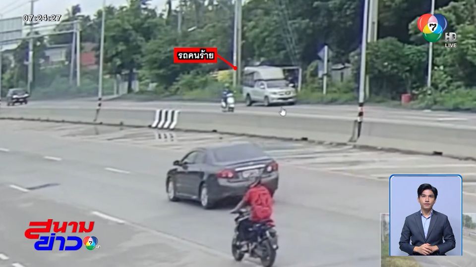 เป็นภาพจากกล้องวงจรปิดที่ติดตั้งไว้บริเวณริมถนนบ้านสังกัจจายน์-ไผ่แปลก ในพื้นที่ หมู่ 2 ตำบลสวนแตง อำเภอเมืองฯ จังหวัดสุพรรณบุรี เมื่อช่วงสายของเมื่อวานนี้ ขณะที่คนร้ายใช้รถกระบะประกบเบียดรถจักรยานยนต์ของผู้เสียหายที่เป็นพ่อค้าลอตเตอรี่ ก่อนจะใช้ปืนจี้ศีรษะ และชิงรถจักรยานยนต์ ให้หนึ่งในสมาชิกแก๊งขี่ตามรถกระบะไป