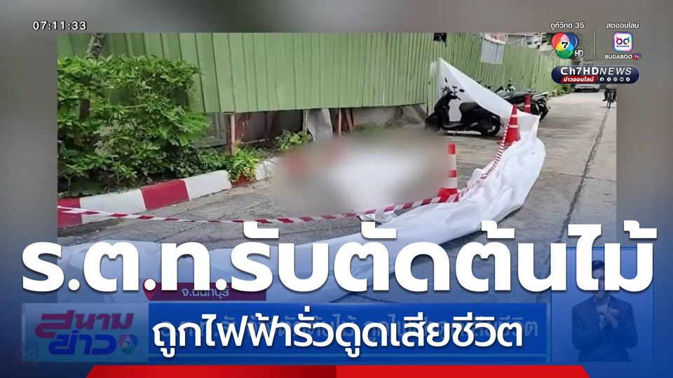 สนามข่าว 7 สี - ที่ จังหวัดนนทบุรี เกิดเหตุสลด ร.ต.ท. กับลูกชาย ไปรับจ้างตัดต้นไม้ในบ้านหรู ก่อนถูกไฟฟ้ารั่วดูดเสียชีวิตต่อหน้าลูกชาย