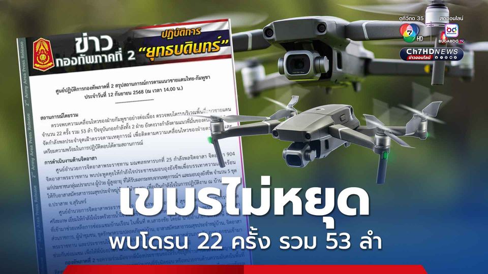 เขมรยังเคลื่อนไหวอย่างต่อเนื่อง กองทัพภาคที่ 2 ตรวจพบโดรน 22 ครั้ง รวม 53 ลำ กองกำลังทั้งสองฝ่ายยังคงวางกำลังตามแนวที่มั่นของตนเอง