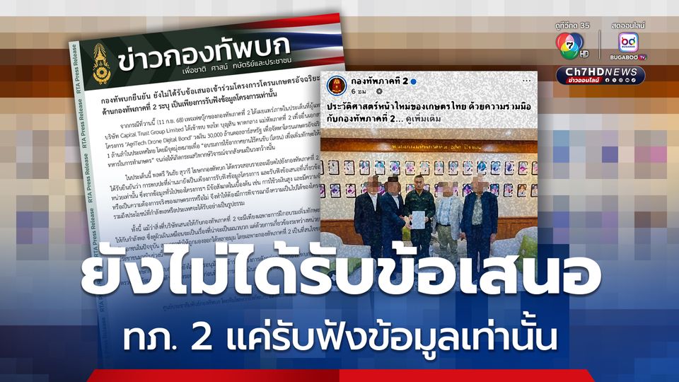 จากกรณีที่วานนี้ (11 ก.ย. 68) เพจเฟซบุ๊กของกองทัพภาคที่ 2 ได้เผยแพร่ภาพในประเด็นที่ผู้แทนบริษัท Capital Trust Group Limited ได้เข้าพบ พลโท บุญสิน พาดกลาง แม่ทัพภาคที่ 2 เพื่อยื่นเอกสารโครงการ "AgriTech Drone Digital Bond" วงเงิน 30,000 ล้านดอลลาร์สหรัฐ เพื่อจัดหาโดรนเกษตรอัจฉริยะ 1 ล้านลำในประเทศไทย โดยมีจุดมุ่งหมายเพื่อ “อบรมการใช้อากาศยานไร้คนขับ (โดรน) เพื่อเพิ่มทักษะให้กับทหารในการทำเกษตร” จนก่อให้เกิดกระแสวิพากษ์วิจารณ์จากสังคมเป็นวงกว้างนั้น
