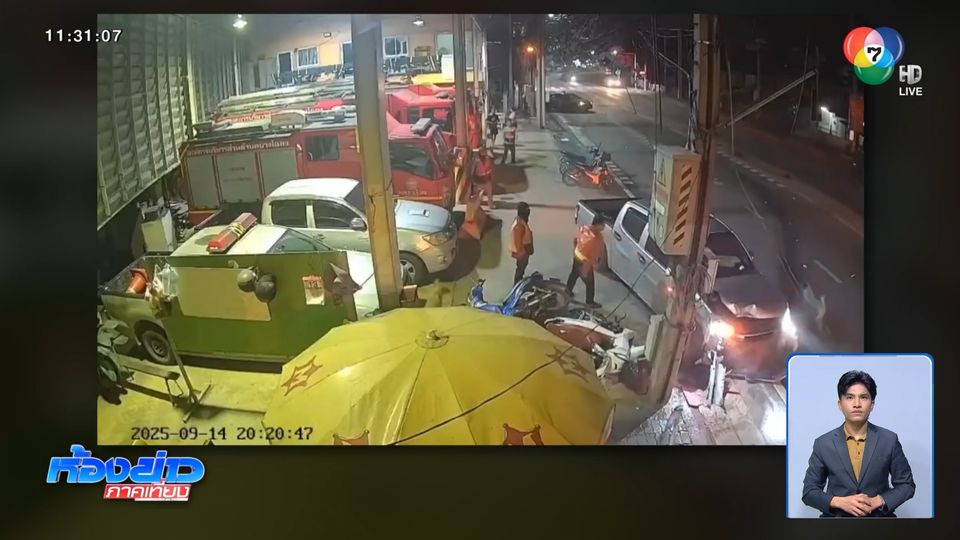 ห้องข่าวภาคเที่ยง - หนุ่มฉี่ม่วง ซิ่งรถกระบะ เสียหลักหมุนคว้าง ข้ามเลนไปชนรถแท็กซี่ แล้วพุ่งชนวินรถจักรยานยนต์ สุดท้ายรถฟาดอัดเข้ากับเสาไฟฟ้า