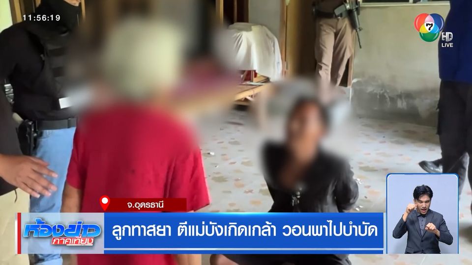 เป็นนาที ที่ตำรวจ สภ.เมืองอุดรธานี บุกจับ นายขวัญ อายุ 40 ปี ภายในบ้านพักแห่งหนึ่ง ที่อำเภอเมืองอุดรธานี หลัง นายขวัญ กักขังแม่บังเกิดเกล้าไว้ในบ้านพัก ก่อนลงมือบีบคอ ใช้ของแข็งตีหน้าผาก ขู่ไม่ให้แม่ร้อง พอแม่หนีออกมาได้ ก็รีบออกไปขอความช่วยเหลือกับตำรวจ