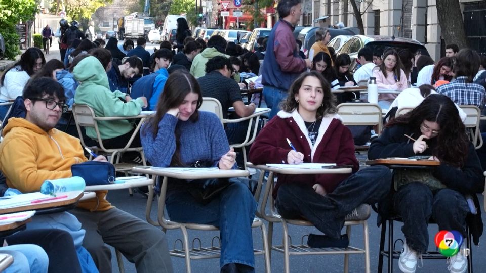วานนี้ (16 ก.ย.) อาจารย์และนักศึกษาคณะปรัชญาและอักษรศาสตร์ มหาวิทยาลัยบัวโนสไอเรส ของอาร์เจนตินา พากันย้ายโต๊ะและเก้าอี้ลงสู่ถนน เพื่อประท้วงสิ่งที่เรียกว่า "แผนการทำลายมหาวิทยาลัยของรัฐ" หลังประธานาธิบดี ฮาเวียร์ มิเลย์ (Javier Milei) แห่งอาร์เจนตินา ที่ปฏิเสธเพิ่มงบปนะมาณสาธารณะ ซึ่งการประท้วงด้วยการจัดห้องเรียนการถนนครั้งนี้เป็นส่วนหนึ่งของแผนการประท้วงที่ยาวนานราว 1 สัปดาห์ ก่อนที่สมาชิกจากมหาวิทยาลัยของรัฐ แพทย์ และผู้เกษียณอายุ เตรียมจะเดินขบวนประท้วงตามท้องถนน เพื่อเรียกร้องให้สมาชิกสภานิติบัญญัติใช้สิทธิวีโต เพื่อยับยั้งร่างกฎหมายงบประมาณประธานาธิบดี มิเลย์