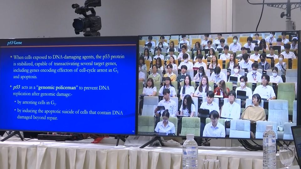 เวลา 12.39 น. วันนี้ สมเด็จพระเจ้าน้องนางเธอ เจ้าฟ้าจุฬาภรณวลัยลักษณ์ อัครราชกุมารี กรมพระศรีสวางควัฒน วรขัตติยราชนารี เสด็จออก ณ ที่ประทับ ชั้น 10 อาคารศูนย์การแพทย์มะเร็งวิทยาจุฬาภรณ์ โรงพยาบาลจุฬาภรณ์ ทรงบรรยายพิเศษเรื่อง "การเกิดโรคมะเร็ง" หรือ Oncogenesis พระราชทานแก่นักศึกษาแพทย์ ชั้นปีที่ 3 คณะแพทยศาสตร์ศิริราชพยาบาล มหาวิทยาลัยมหิดล ประจำปีการศึกษา 2568 ผ่านสื่ออิเล็กทรอนิกส์ออนไลน์ ซึ่งเป็นการบรรยายครั้งที่ 3 ในหัวข้อ "การควบคุมการเพิ่มจำนวนของเซลล์ การเกิดเซลล์ตาย และเมแทบอลิซึมของเซลล์มะเร็ง" โดยได้พระราชทานความรู้เกี่ยวกับวัฏจักรการแบ่งตัวของเซลล์ ซึ่งแบ่งออกเป็น 4 ระยะ แต่ละระยะจะมีกลไกตรวจสอบและควบคุมความถูกต้องของกระบวนการทำงาน โดยอาศัยสัญญาณชีวภาพที่ส่งเข้าสู่เซลล์เพื่อกระตุ้นการตอบสนอง หากกลไกควบคุมนี้บกพร่อง อาจนำไปสู่การเกิดโรคมะเร็ง ทั้งนี้ เซลล์มะเร็งซึ่งมีการแบ่งตัวเพิ่มขึ้นอย่างต่อเนื่อง จำเป็นต้องปรับเปลี่ยนรูปแบบการทำงานของกระบวนการเมแทบอลิซึม โดยอาศัยปฏิกิริยาต่าง ๆ ที่เกิดขึ้นตามลำดับ เพื่อช่วยรักษาสมดุลในร่างกาย