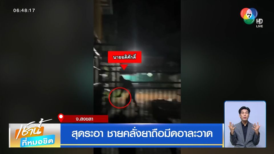 เจ้าของบ้านถ่ายคลิปช่วง 05.00 น. วานนี้ (17 ก.ย.) ขณะที่ นายอดิศักดิ์ ใช้มีดพร้า 2 เล่ม ฟันประตูรั้ว พยายามบุกเข้าไปในบ้านพัก ตำบลหัวเขา อำเภอสิงหนคร จังหวัดสงขลา พอเข้าไม่ได้ ยืนลับมีดโชว์ พร้อมบ่นพึมพำ