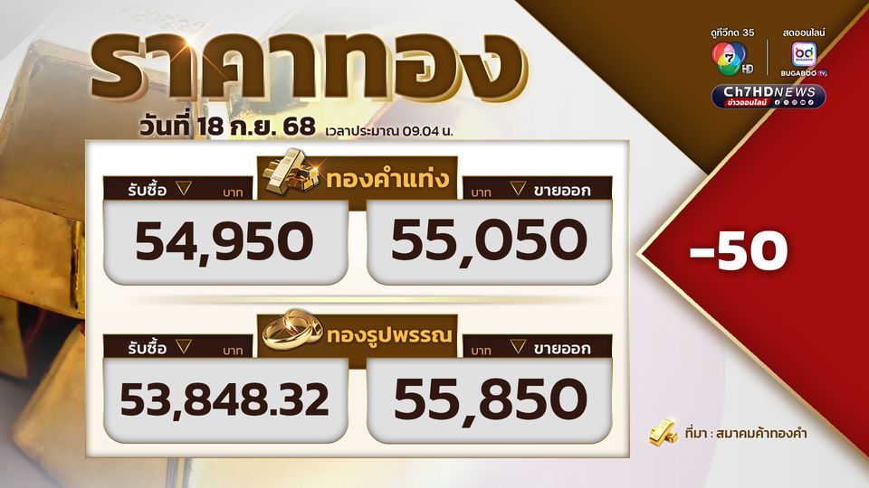 ราคาทอง โดยสมาคมค้าทองคำ รายงานราคาทองวันนี้ (18 ก.ย. 68) เปิดตลาดราคาทองปรับลง 50 บาท ขายออกที่บาทละ 55,050 บาท โดยทองคำแท่งรับซื้อที่ 54,950 บาท ขายออกที่ 55,050 บาท ทองรูปพรรณรับซื้อที่ 53,848.32 บาท ขายออก 55,850 บาท