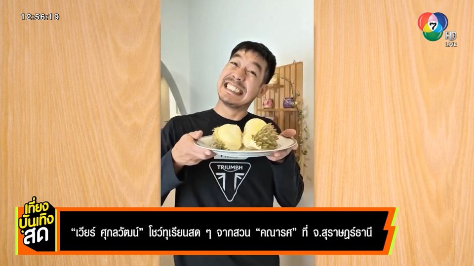 เที่ยงบันเทิงสด - จะบอกว่าช่วงนี้ทางภาตใต้ ทุเรียนออกพร้อมขายแล้ว เขาว่าทุเรียนใต้อร่อย มี 1 คนมาคอนเฟิร์ม เวียร์ ศุกลวัฒน์ นั่นเอง เขาโพสต์คลิปนี้ในไอจี ดูสิทุเรียนอย่างฉ่ำเลย น่ากินมาก เหลืองอร่ามเนื้อเต็มพูสุด ๆ