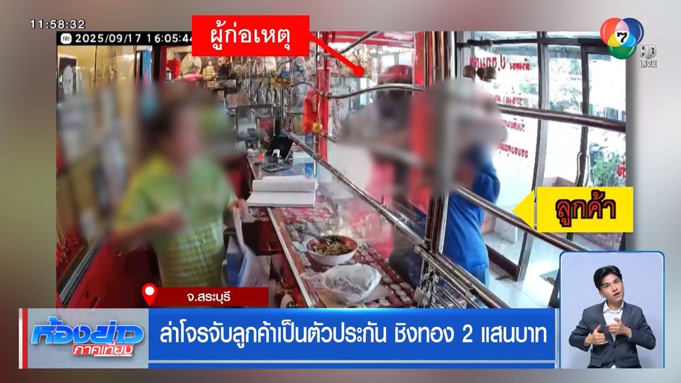 เหตุนี้เกิดขึ้นช่วงเย็นวานนี้ คนร้ายขี่รถจักรยานยนต์สีดำ ไม่ติดแผ่นป้ายทะเบียน มาจอดหน้าร้านทองในตลาดใหม่ท่าลาน ตำบลบ้านครัว อำเภอบ้านหมอ จังหวัดสระบุรี พอสบโอกาสคนร้ายเดินเข้ามาในร้าน เป็นจังหวะเดียวกับที่ นางสุรีย์นุท อายุ 57 ปี ลูกค้าที่นำทองมาจำนำครึ่งสลึง ราคา 5,000 บาท กำลังจะเดินออกจากร้านพอดี เธอจึงถูกคนร้ายผลักให้เข้าไปในร้าน แล้วใช้มือล็อกคอแล้วใช้มีดปลายแหลมจี้เธอเป็นตัวประกัน