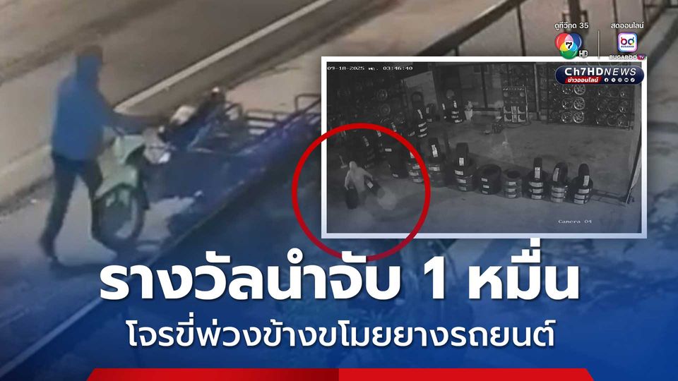 เจ้าของร้านตั้งรางวัลนำจับ 1 หมื่นบาท ล่าคนร้ายขโมยยางรถยนต์ในร้าน 4 เส้น ขึ้น จยย.พ่วงข้าง หลบหนีลอยนวล คาดนำไปตระเวนขาย
