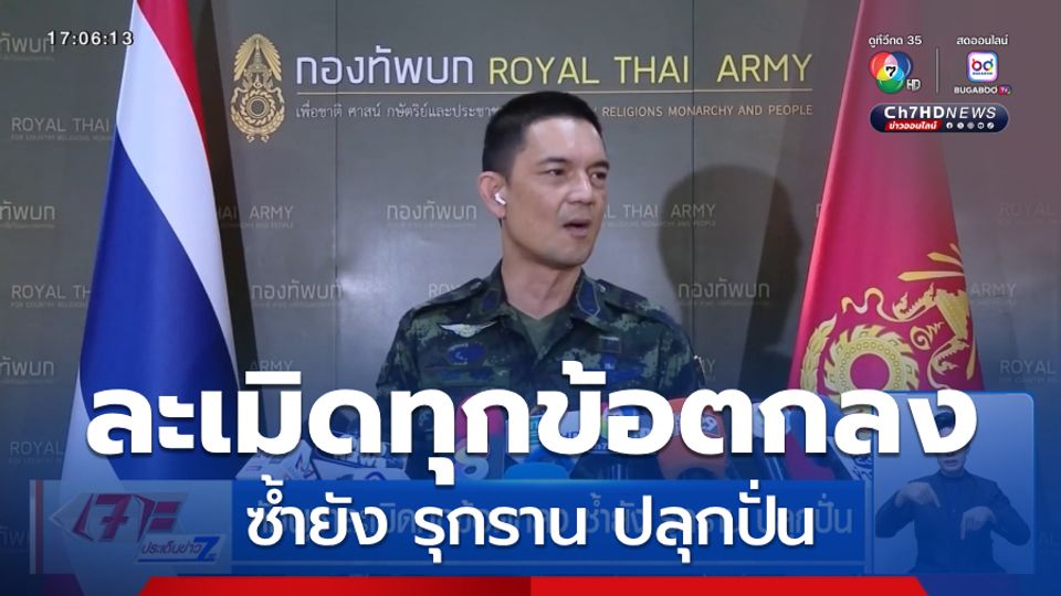 เจาะประเด็นข่าว 7HD - จากกรณีที่ กัมพูชาออกมาประท้วงและกล่าวหาไทยต่าง ๆ นา ๆ ล่าสุด กองทัพบก ออกมาย้ำชัดว่า เราดำเนินการทุกอย่างภายใต้กรอบของกฎหมายและข้อตกลง ไม่เคยรุกราน หรือ ละเมิดอธิปไตยกัมพูชา กลับกันฝั่งกัมพูชาเองที่ทำผิดข้อตกลงทุกอย่าง