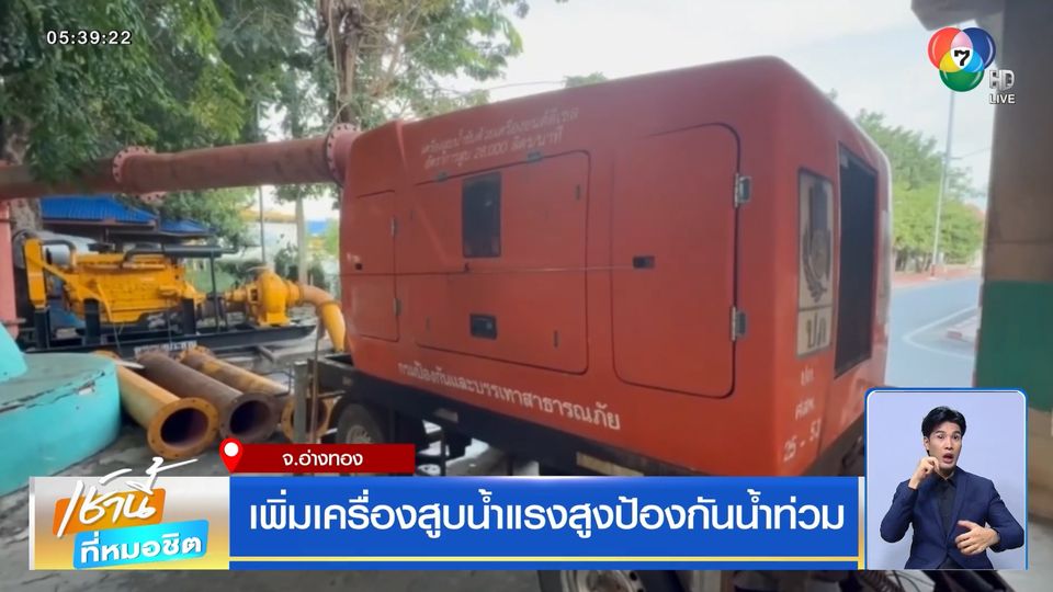 จังหวัดอ่างทอง เจ้าหน้าที่นำเครื่องสูบน้ำขนาดใหญ่ของสำนักงานป้องกันและบรรเทาสาธารณภัย นำมาติดตั้งในจุดเสี่ยงริมแม่น้ำเจ้าพระยาหน้าศูนย์ราชการจังหวัดอ่างทอง เพื่อสูบน้ำออกจากพื้นที่ หลังระดับน้ำในแม่น้ำเจ้าพระยาสูงกว่าท่อระบายน้ำ ประกอบกับช่วงหลายวันที่ผ่านมามีฝนตกหนักทำให้ไม่สามารถระบายน้ำได้ทัน