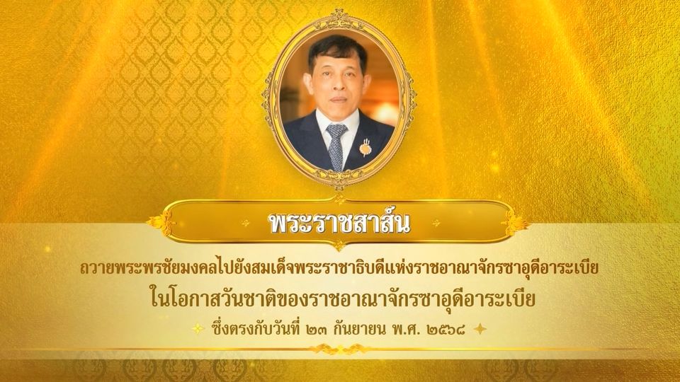 ในโอกาสวันชาติของราชอาณาจักรซาอุดีอาระเบีย หม่อมฉันขอถวายพระพรชัยมงคล และความปรารถนาดีด้วยใจจริง เพื่อฝ่าพระบาททรงมีพระพลานามัยสมบูรณ์แข็งแรงและทรงพระเกษมสำราญ ทั้งเพื่อสันติสุขและความรุ่งเรืองไพบูลย์ของประเทศและประชาชนชาวซาอุดีอาระเบีย