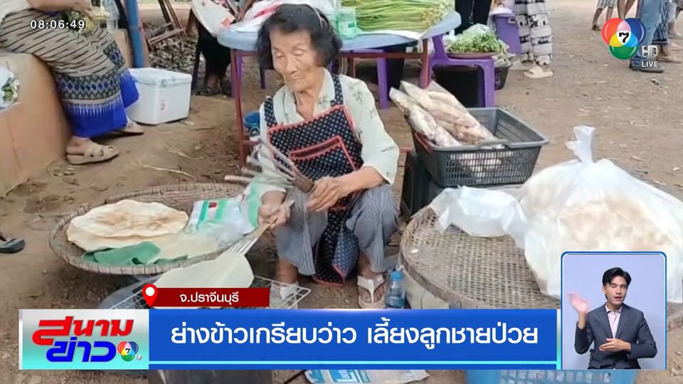 สนามข่าว 7 สี - หญิงชรา ที่อายุเข้าเลข 8 แล้ว แต่ต้องมานั่งย่างข้าวเกรียบว่าว เร่ขายตามงานวัด หาเงินมาเลี้ยงดูลูก ที่ประสบอุบัติจนกลายเป็นผู้ป่วยติดเตียง