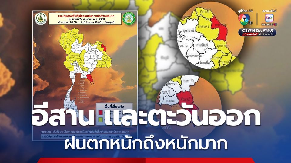 อากาศวันนี้ (24 ก.ย.68) ภาคอีสาน และตะวันออก มีฝนตกหนักถึงหนักมากบางแห่ง ส่วนภาคเหนือ และภาคกลางมีฝนตกหนักบางพื้นที่ โดยเฉพาะบริเวณจังหวัดนครพนม จันทบุรี และตราด ส่วนภาคใต้มีฝนฟ้าคะนองบางแห่ง ขอให้ประชาชนบริเวณประเทศไทยตอนบนระวังอันตรายจากฝนตกหนักถึงหนักมากและฝนที่ตกสะสม ซึ่งอาจทำให้เกิดน้ำท่วมฉับพลัน น้ำป่าไหลหลาก และน้ำล้นตลิ่ง โดยเฉพาะพื้นที่ลาดเชิงเขาใกล้ทางน้ำไหลผ่าน พื้นที่ลุ่ม และพื้นที่น้ำท่วมขัง เนื่องจากร่องมรสุมพาดผ่านภาคเหนือ และภาคตะวันออกเฉียงเหนือ ประกอบกับมรสุมตะวันตกเฉียงใต้กำลังปานกลางที่พัดปกคลุมทะเลอันดามัน ภาคใต้ ภาคกลาง ภาคตะวันออก และอ่าวไทยมีกำลังแรงขึ้น