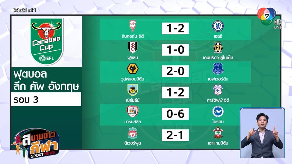 สนามข่าวกีฬา - ผลฟุตบอลลีก คัพ อังกฤษ อูโก้ เอกิติเก้ ยิงประตูชัยให้ ลิเวอร์พูล เอาชนะ เซาแทมป์ตัน แต่ดันถอดเสื้อดีใจจนโดนไล่ออก