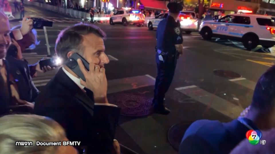 สำนักข่าว BFMTV ของฝรั่งเศส เผยภาพขณะประธานาธิบดีเอ็มมานูเอล มาครง แห่งฝรั่งเศส ต่อสายโทรศัพท์ถึงประธานาธิบดีโดนัลด์ ทรัมป์ แห่งสหรัฐฯ เมื่อคืนวันจันทร์ที่ผ่านมา (22 ก.ย.) ตามเวลาท้องถิ่น หลังผู้นำฝรั่งและผู้ติดตามถูกเจ้าหน้าที่ตำรวจสหรัฐฯ หยุดไม่ให้เขาและคณะข้ามถนนในนครนิวยอร์ก เพื่อเคลียร์พื้นที่รอกับขบวนรถของประธานาธิบดีทรัมป์