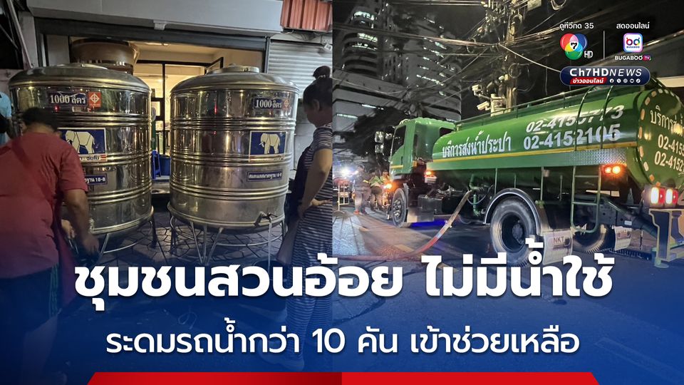 การประปาระดมรถน้ำกว่า 10 คัน เข้ามาเติมใส่ถังขนาดใหญ่ให้กับชาวบ้านชุมชนสวนอ้อยกว่า 200 หลังคาเรือน ที่ยังไม่มีน้ำประปาใช้ หลังถนนยุบตัวตั้งแต่ 7 โมงเช้าที่ผ่านมา