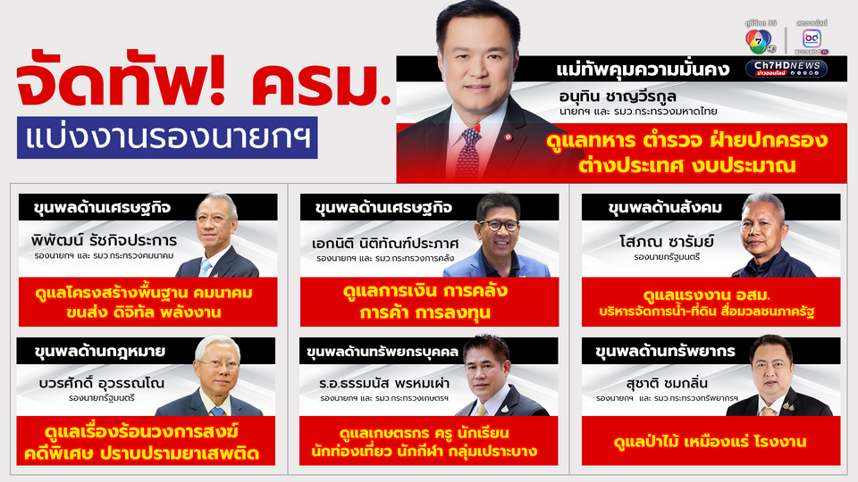 ที่ประชุมคณะรัฐมนตรีนัดพิเศษเมื่อวานนี้ (24 ก.ย.68) มีมติแบ่งงานรองนายกรัฐมนตรี 6 คน ดังนี้