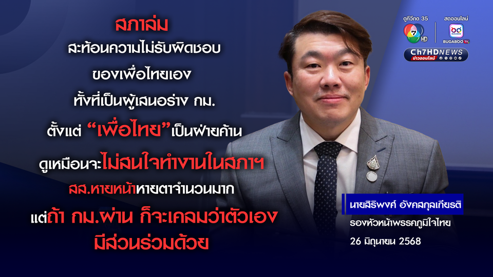 วันนี้ (26 ก.ย.68) นายสิริพงศ์ อังคสกุลเกียรติ รองหัวหน้าพรรคภูมิใจไทย กล่าวถึงเหตุการณ์สภาผู้แทนราษฎรล่ม ระหว่างการพิจารณาร่างพระราชบัญญัติ (พ.ร.บ.) บริหารจัดการเพื่ออากาศสะอาด หรือ “ร่าง กม.อากาศสะอาด” ว่า ปัญหาที่เกิดขึ้นสะท้อนถึงความไม่รับผิดชอบของพรรคเพื่อไทยเอง ซึ่งเป็นผู้เสนอร่างกฎหมาย แต่กลับไม่อยู่ร่วมเป็นองค์ประชุม