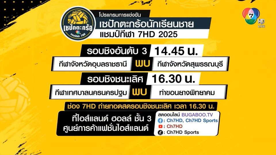 ส่วนคู่ชิงชนะเลิศ กีฬาเทศบาลนครนครปฐม พบ ท่าขอนยางพิทยาคม แข่งขันในเวลา 16.30 น. ถ่ายทอดสดทางช่อง 7HD กด 35 และสดทางออนไลน์ หรือเชียร์ติดขอบสนามได้ที่ไอส์แลนด์ ฮอลล์ ชั้น 3 ศูนย์การค้าแฟชั่นไอส์แลนด์ เข้าชมฟรี อย่าพลาดชม