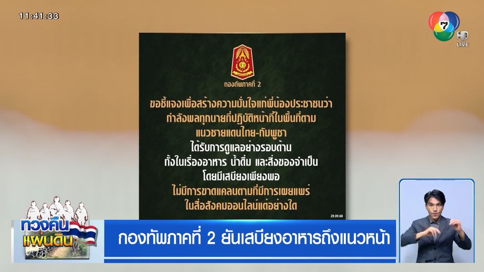 ล่าสุด กองทัพภาคที่ 2 แจงแล้ว บอกว่า กำลังพลทุกนายที่ปฏิบัติหน้าที่ตามแนวชายแดนไทย-กัมพูชา ได้รับการดูแลอย่างรอบด้าน ทั้งในเรื่องอาหาร น้ำดื่ม และสิ่งของจำเป็น โดยมีเสบียงเพียงพอ ไม่มีการขาดแคลนตามที่มีการเผยแพร่ในสื่อสังคมออนไลน์แต่อย่างใด