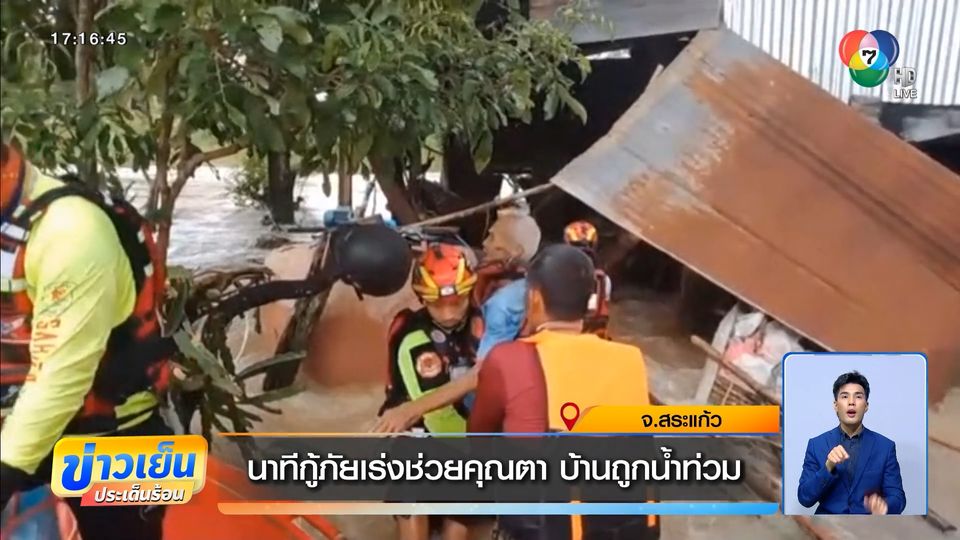 นาทีที่กู้ภัยเร่งช่วยเหลือ คุณตาบุญชู อายุ 98 ปี ติดอยู่ในบ้าน ท่ามกลางน้ำป่าไหลหลากแรง ในพื้นที่ ตำบลบ้านแก้ง อำเภอเมืองสระแก้ว จังหวัดสระแก้ว หลังฝนตกหนักทั้งคืน จนเกิดน้ำป่าไหลหลากเข้าท่วมหลายหมู่บ้าน ซึ่งทีมกู้ภัยสามารถช่วยคุณตาออกมาจากบ้าน ท่ามกลางกระแสน้ำที่ไหลเชี่ยวกรากได้อย่างปลอดภัย