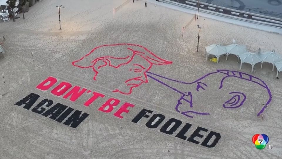 ชายหาดในกรุงเทลอาวีฟ ปรากฎภาพงานศิลปะบนผืนทราย เตือน "ทรัมป์" ระวังถูกนายกรัฐมนตรีอิสราเอลหลอกซ้ำซาก