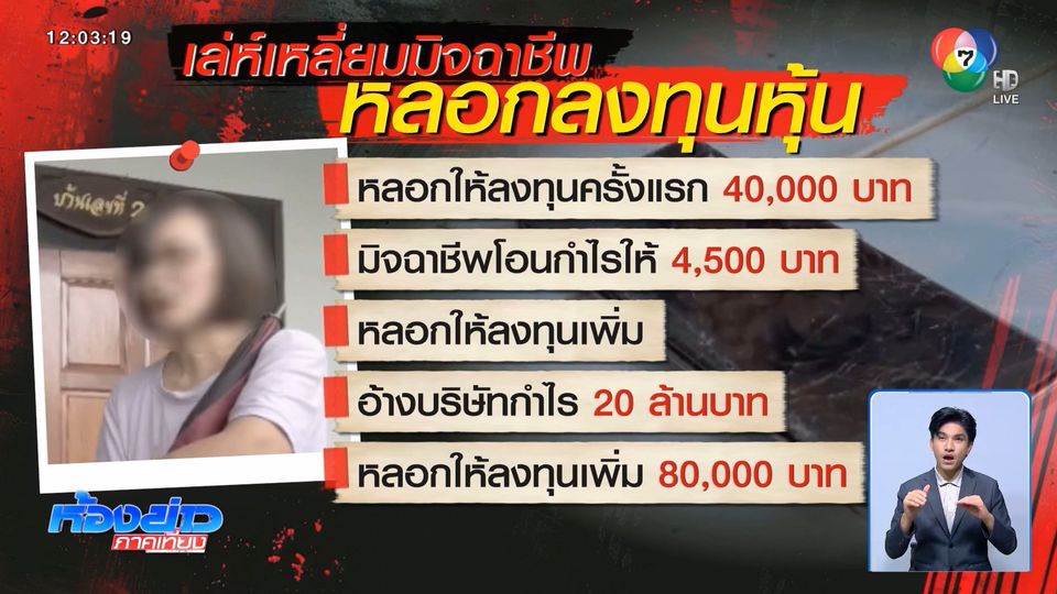 ภรรยา เล่าว่า ถูกชวนให้ลงทุนเล่นหุ้น เมื่อประมาณ 2-3 เดือน ที่ผ่านมา เริ่มลงทุนครั้งแรก 40,000 บาท เพียงวันเดียว ได้กำไรโอนเข้าบัญชี 4,500 บาท ส่วนเงินต้นยังอยู่กับเพื่อน จากนั้นเพื่อนบอกให้โอนเงินเพิ่มเข้าไปเติมเรื่อย ๆ ครั้งละ 40,000-50,000 บาท และล่าสุด เพื่อนบอกว่าเงินหุ้นที่เล่นมีกำไรงอกถึง 20 กว่าล้านบาท ตอนนี้ธนาคารแห่งประเทศไทยโอนมาไว้ที่บริษัทแล้ว แต่เราต้องจ่ายดอกเบี้ยให้บริษัทก่อน ถึงจะนำเงินจำนวนดังกล่าวออกมาได้ แต่ต้องโอนเงินไปอีก 80,000 บาทก่อน