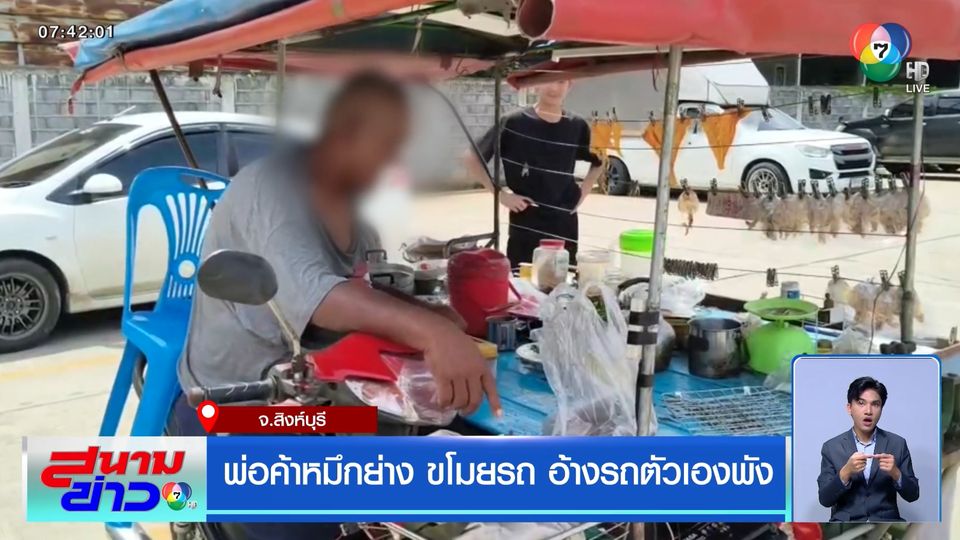 สนามข่าว 7 สี - พ่อค้าหมึกย่าง เห็นรถจักรยานยนต์ใครไม่รู้จอดทิ้งริมถนน จ้างคนช่วยยกกลับบ้าน ดัดแปลงพ่นสีทำเป็นรถพ่วงขายหมึก แต่เจ้าของจำได้ แจ้งตำรวจรวบพร้อมของกลาง