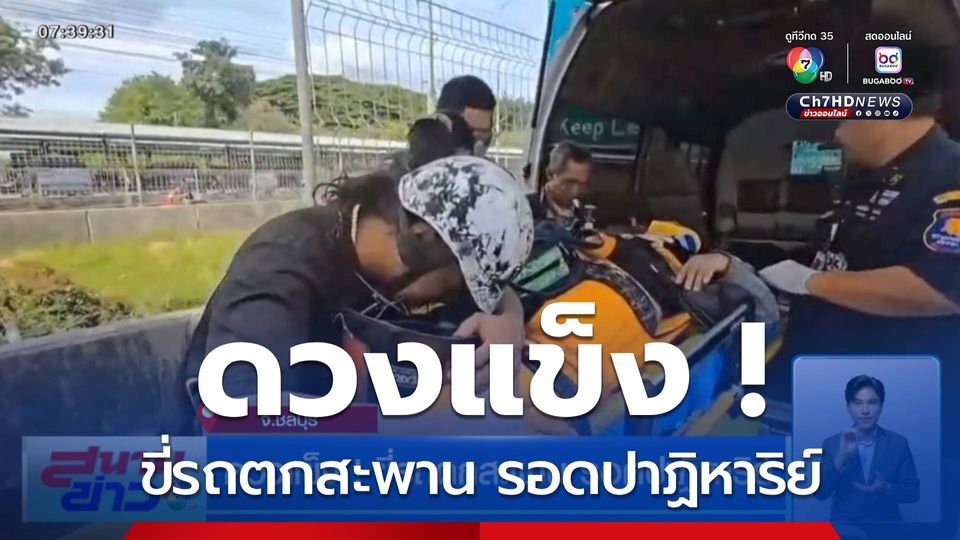 สนามข่าว 7 สี - สามีภรรยาคู่ดวงแข็ง ขี่รถจักรยานยนต์ผิดเส้นทาง ขึ้นไปบนสะพานกลับรถ พอรู้ตัวก็กลับตัวไม่ทัน พุ่งชนขอบปูนกั้นสะพาน ร่วงลงไปด้านล่าง รอดปาฏิหาริย์