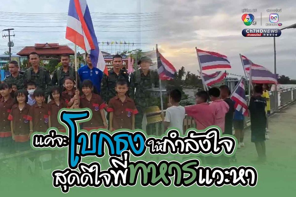 นักเรียนโบกธงชาติไทย ทักทายให้กำลังใจพี่ทหารที่ขับรถผ่านมา ระหว่างจะไปทำภารกิจที่ชายแดนไทย-กัมพูชา ล่าสุด นักเรียน สุดตื่นเต้น พี่ทหารจอดรถลงมาทักทาย ขณะที่ ชาวบ้านและหน่วยงานรัฐ เอาข้าวของมาเป็นของฝากไปชายแดน ทำทหารน้ำตาซึม