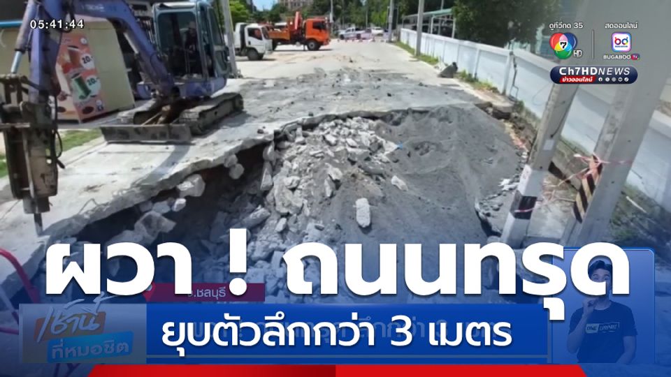 เช้านี้ที่หมอชิต - ที่จังหวัดชลบุรี ชาวบ้านผวาเกิดเหตุถนนยุบตัวลึกกว่า 3 เมตร เจ้าหน้าที่ต้องปิดถนน เพื่อเร่งแก้ไข