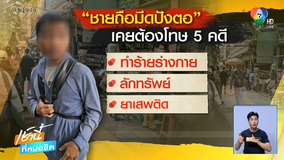 เช้านี้ที่หมอชิต - ตามต่อคดีชายคลั่ง ถือมีดปังตอไล่ฟันคนขี่รถจักรยานยนต์รับจ้าง ตำรวจก็ไล่เช็กจนรู้ว่าเป็นใคร และพบเคยถูกดำเนินคดีถึง 5 คดี และยังเตรียมออกหมายจับเพิ่มอีก 3 ข้อหา