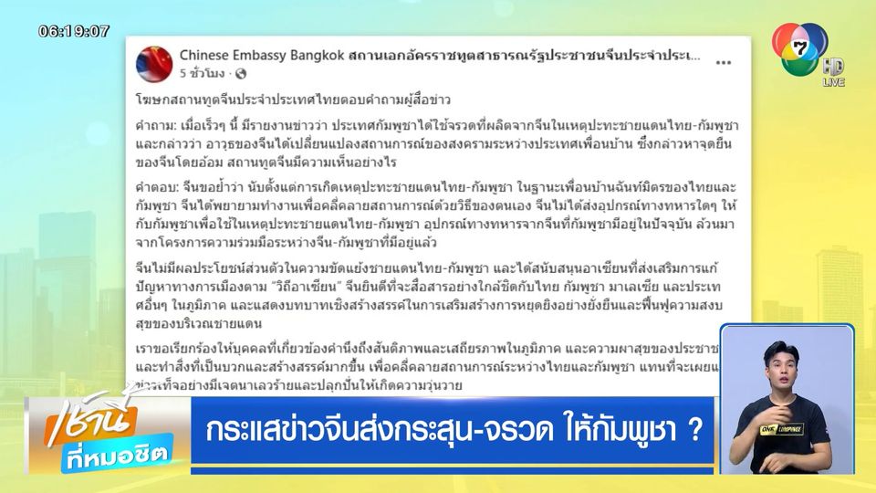 สอดคล้องกับคำชี้แจงจากสถานเอกอัครราชทูตสาธารณรัฐประชาชนจีนประจำประเทศไทย ยืนยันว่านับตั้งแต่การเกิดเหตุปะทะชายแดนไทย-กัมพูชา ในฐานะเพื่อนบ้านฉันมิตรของไทย และกัมพูชา