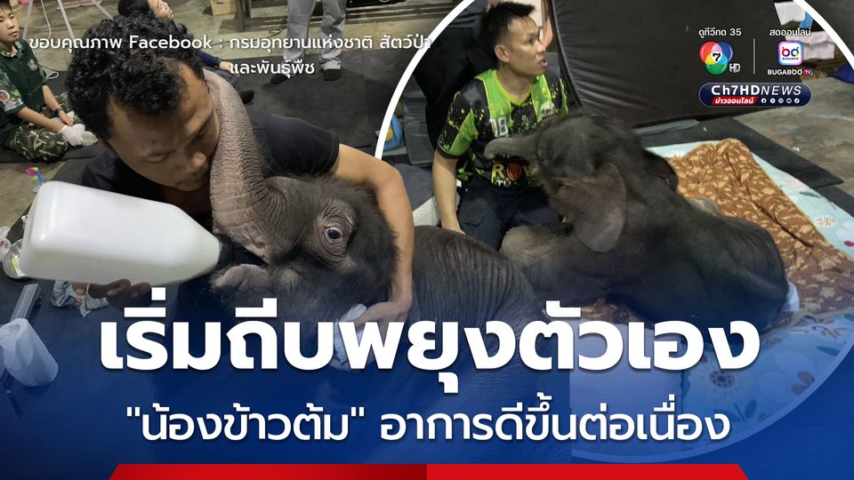 อัปเดตอาการช้างป่า "น้องข้าวต้ม" อาการดีขึ้นต่อเนื่อง ทีมสัตวแพทย์เผยกำลังขาแข็งแรงขึ้น เริ่มถีบเพื่อพยุงให้ตัวเองยืนได้บ่อยครั้ง